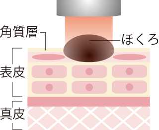 いぼ・ほくろ除去に使用するCO2炭酸ガスレーザーは、水分に反応する10600nmの波長をもち、隆起した部分、メラニンを含めたほくろ全体を蒸散させて削り取る治療です。
