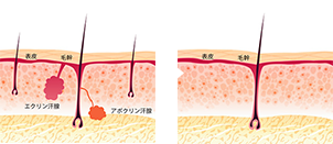 マイクロ波による熱の力で臭いと汗を分泌する汗腺を破壊します。一度破壊した汗腺は再生しないため、効果は半永久的です。