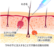 わきなど汗が気になる部分に注入することでエクリン汗腺の活動を抑制し汗の分泌が抑えられます。